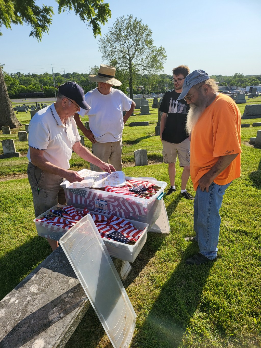 Brothers of Hecker Camp #443 gathered May 27 to place U.S. flags on the graves of Union Civil War Veterans at Walnut Hill Cemetery in Belleville, Illinois. (Pictured left to right) PCC Greg Zelinske, JVC John Stanton, Camp Guide Justin Ottolini and SVC Russel Schleicher. (Photo by Gerald Sonnenberg)