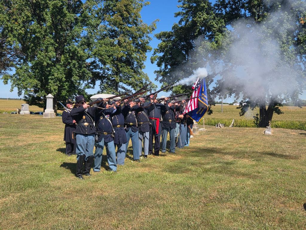 (Above) A three-volley salute and presentation of the colors is conducted Sept. 8 at the Summerfield, Illinois cemetery event by a combined group of members of the Col. Hecker Camp in Illinois and U.S. Grant Camp #68 in Missouri, along with other SUVCW members and volunteers. The flag bearers are Bob Eversgerd (U.S. flag) and Joe Langenhorst. (Photo by Sheila Wildermuth)