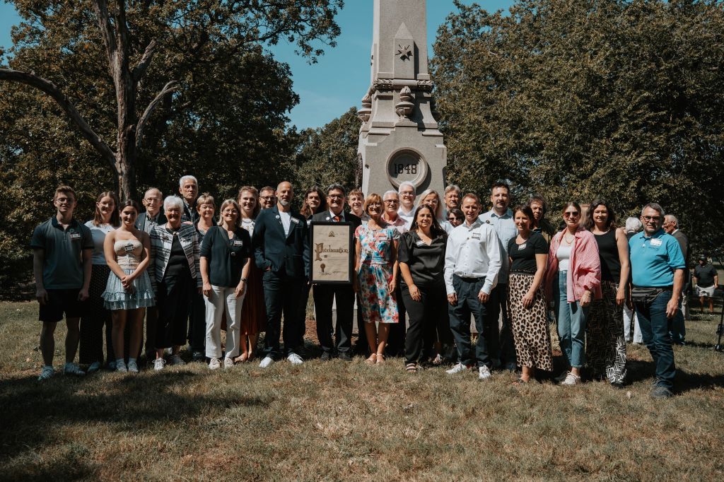 Approximately 80 people attended each ceremony in St. Louis and Summerfield. This includes former Missouri Congressman Russ Carnahan who attended the Benton Park event. The Benton Park event included a Proclamation from the City of St. Louis Mayor Kara Spencer in recognition of Col. Hecker, and one of Hecker’s great-great-great-granddaughters, Caroline Hecker, who is a reporter with local television station KMOV, participated in the unveiling of the restored obelisk along with her cousin Dr. Caroline Hecker. Hecker’s TV station covered the event. A link to the report is here https://www.firstalert4.com/2025/09/09/historic-monument-benton-park-restored-german-delegation-travels-st-louis-rededication-ceremony/.